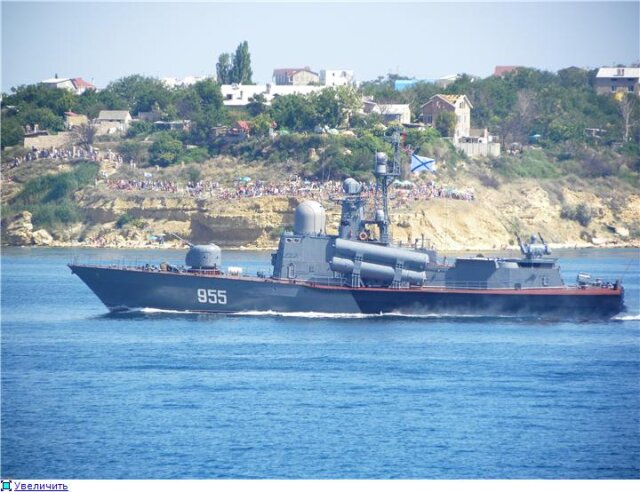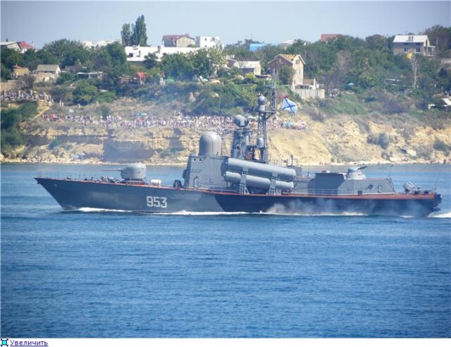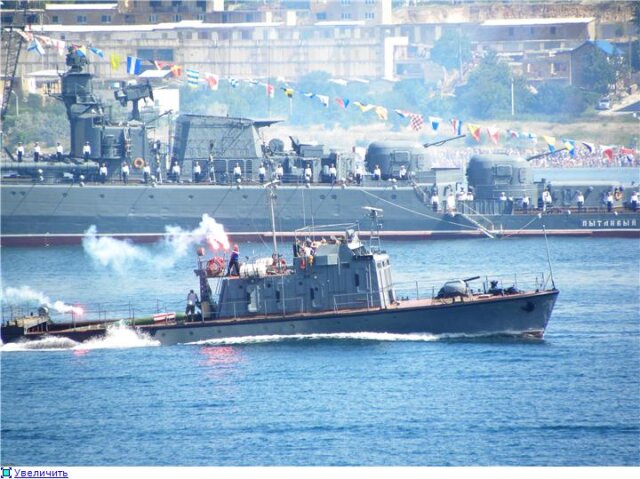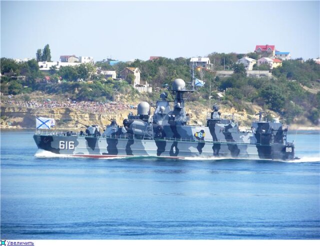 Традиционно открыл парад кораблей ракетный корабль на воздушной подушке "Бора". В отличие от старых-добрых времен, подушку от свою не раскрывал.