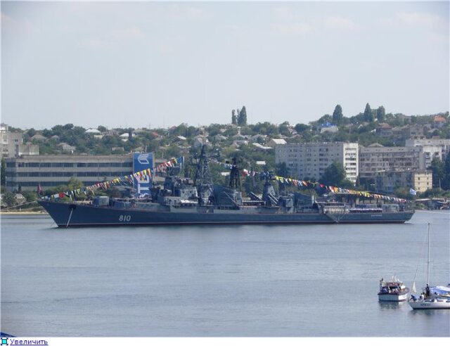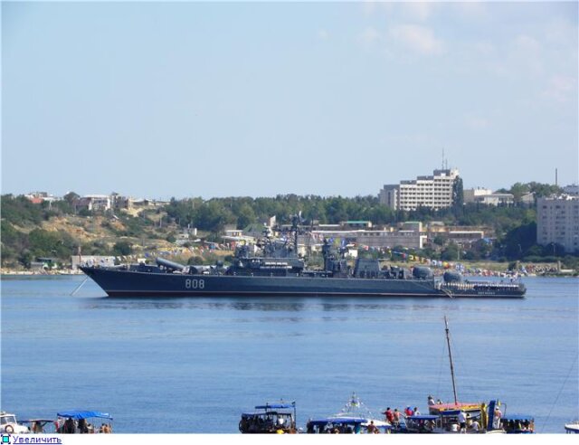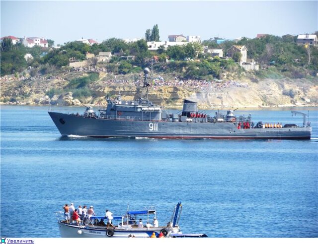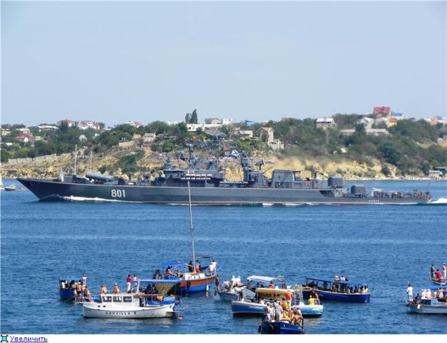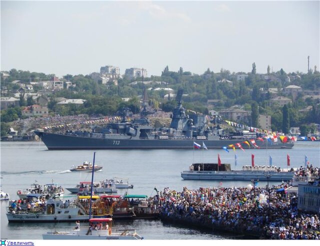 Забегая вперед скажу, что просмотр с балкончика и с Хрусталки - это как небо и земля. Полный эффект присутствия, выстрелы, залпы и пулеметные очереди буквально в 300-х метрах, до Хрусталки мало что доносится. Мои ощущения впечатления и ощущения были прямо как в детстве на этом же празднике, когда слух постоянно проверялся на прочность. Стрельбы было много, что радует. Конечно, не было макетов посреди бухты, не было пусков ракет, не было погружений подлодки, не было авиации и даже не было пусков из реактивных бомбометательных установок. Это все в прошлом, но надежда теплится, что когда-нибудь в программу все это вернется. Но даже без этого всего с балкончика смотрелось и слушалось отлично, за исключением той маленькой детали, конечно, что с 6:45 до конца парада, т.е. 11:20, нужно стоять на одном месте без движения в любую сторону (на секунде потеряешь бдительность и народ уже тиснется). Народищу было очень много, причем очень много украиноговорящих. Интересно, если западенцы против пребывания ЧФ в Севастополе, чего ж они приезжают смотреть на праздник вражеского флота? Умом не понять не только Россию